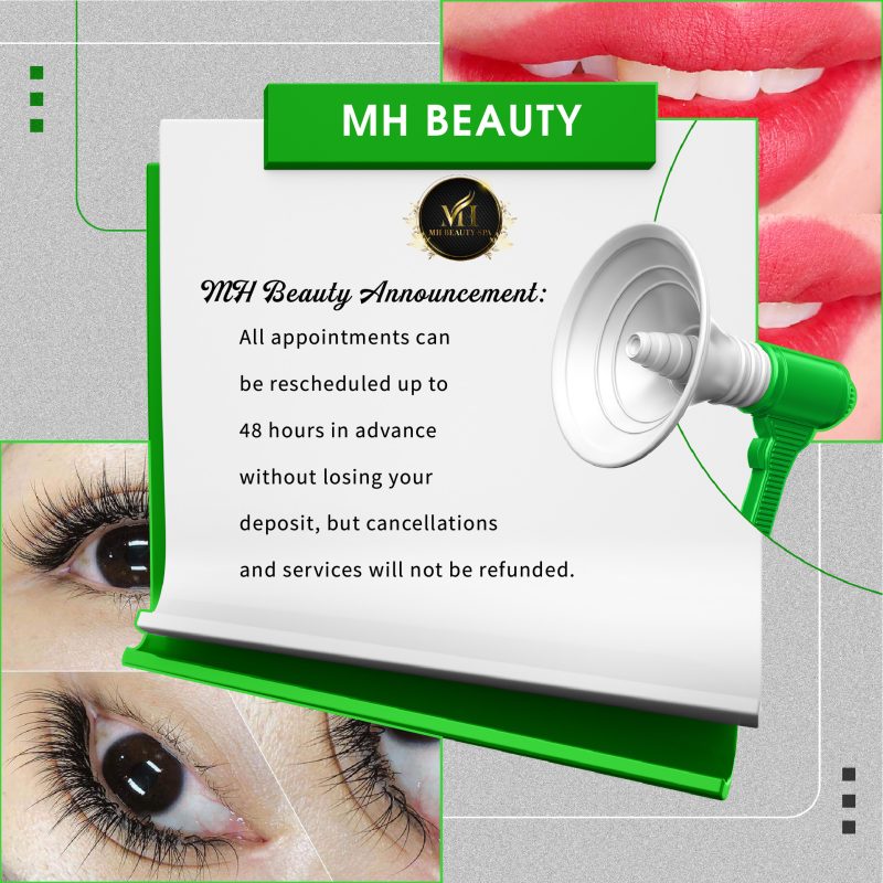 • MH Beauty Spa reserves the right to publish, post & promote photos taken on our private property. If you do not wish to have your photo posted or promoted, please let us know.